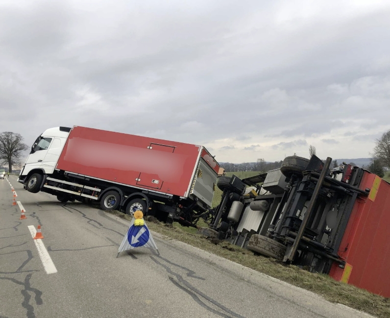 Der Lastzug sei nach rechts ausgewichen und mit dem rechten Spiegel gegen ein Verkehrsschild geprallt. In der Folgte kippte das schwere Fahrzeug mit dem Güteranhänger auf die rechte Seite in eine Böschung. Der Fahrer erlitt laut Polizeiangaben einen Schock, blieb aber unverletzt.