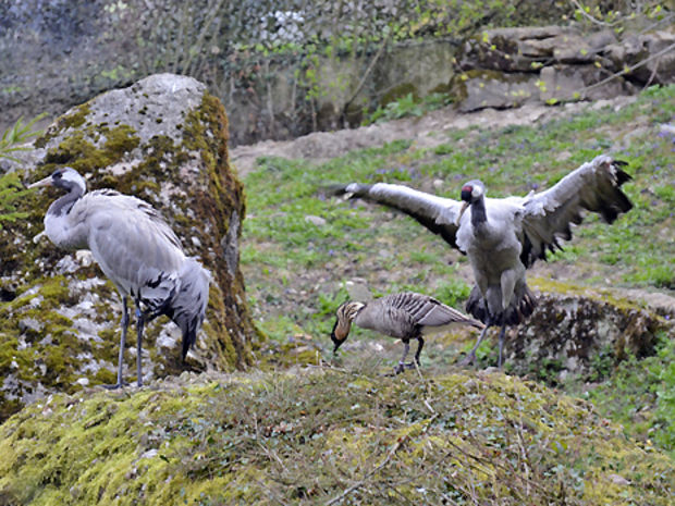 Im Tierpark Goldau ist Balzzeit. Jeweils bei Tagesanbruch beginnt der Kranichmann mit weithin hörbarem Trompeten, um seine Angebetete zu werben. Das hat nun auch einen alleinstehenden Hawai-Gänserich animiert, mit seinen Rufen das Kranichweibchen zu beeindrucken.