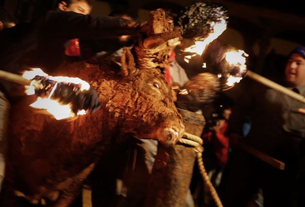 Am Strassenrand hinter Zäunen jubeln Zuschauer dem traditionellen Spektakel zu. Der Stier ist an einem Pfahl festgebunden, während die Bälle schliesslich angezündet werden. Durch die Hitze schmilzt das Innere des Horns, der flüssige Teer tropft dem Stier den Kopf hinunter, in die Augen und auf den Rücken. Dann wird der «brennende Stier» losgelassen und durch die Strassen gejagt.