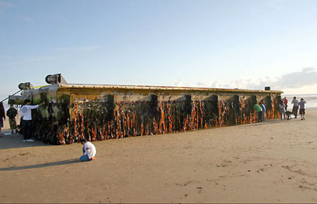Der 20 Meter lange, 6 Meter breite und 2 Meter hohe Ponton aus Beton, Stahlstangen und einer Styropor-Füllung wurde am Montag nahe der Küste gesichtet und dann von der Flut in Agate Beach 160 Kilometer südwestlich von Portland an Land gespült.