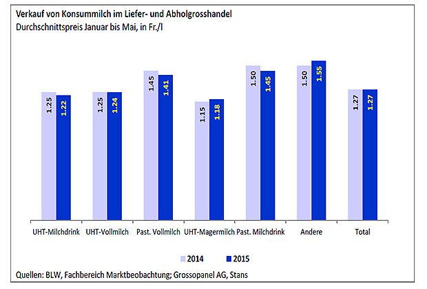 Die Preise der meisten UHT-Milchsorten verzeichneten einen leichten Rückgang (–0,2 % auf 1,24 Fr./l bei der UHT-Vollmilch und –2,3 % auf 1,22 Fr./kg beim UHT-Milchdrink). Der Preis für UHT-Magermilch erhöhte sich hingegen. Bei der Past-Milch wurde der stärkste Preisrückgang in den ersten fünf Monaten des Jahres 2015 beobachtet.