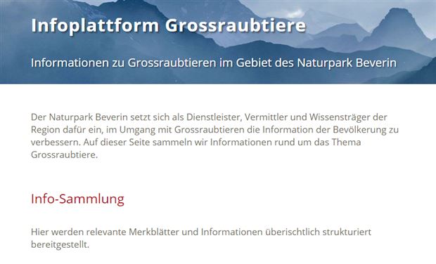Die mitgesendete Befragung zum Thema Grossraubtiere im Naturpark Beverin zeigte, dass vor allem der Bedarf nach transparenten Informationen nach wie vor gross sei, heisst es in einer Medienmitteilung.  Basierend auf diesen Rückmeldungen und Anregungen hat der Naturpark Beverin nun eine Infoplattform erarbeitet. Unter www.infoplattform-grossraubtiere.ch sollen ergänzend zu den bestehenden Informationskanälen von offizieller Seite im Besonderen regionale Hintergrundinformationen zur Verfügung gestellt werden. Zudem können sich Interessierte mittels einer Newsletter-Funktion anmelden, welche jeweils die Aufschaltung neuer Informationen und Beiträge meldet.