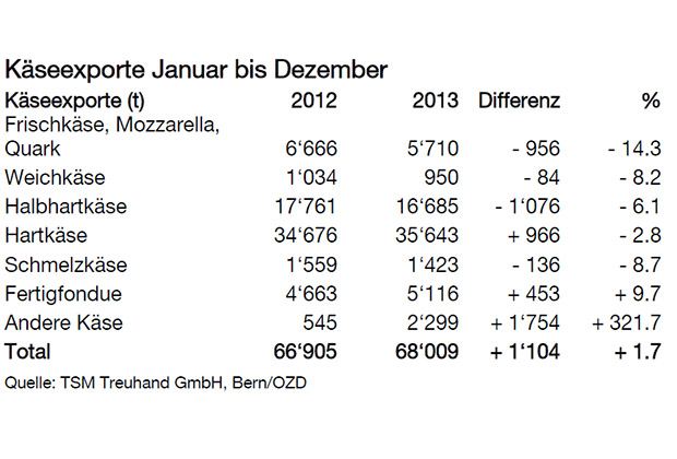 Der Erlös für die Käsebranche erhöhte sich von 576.1 Mio. Fr. im 2012 auf 603.5 Mio. Fr. im 2013. Mengenmässig erhöhten sich die Ausfuhren gemäss SCM und TSM Treuhand GmbH (TSM) 2013 um 1‘104 Tonnen auf 68'009 Tonnen (+1.7%).