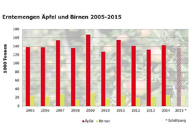 Von den 183'800 Tonnen Äpfel wachsen 136'800 Tonnen in Apfelanlagen und 46'900 Tonnen auf Hochstamm-Feldobstbäumen. Rund 113'600 Tonnen werden als Tafeläpfel, 70'200 Tonnen als Mostäpfel geerntet. Die Tafelapfelmenge liegt im Bereich des Vorjahres, die Mostapfelernte wird voraussichtlich um 13 % tiefer ausfallen als 2014. Bei den Birnen stammen von den erwarteten 35'100 t zwei Drittel aus Anlagen (22 700 t), ein Drittel (12 400 t) von Hochstamm-Feldobstbäumen. Die Birnen aus den Anlagen werden vorwiegend als Tafel- und Industrieobst verwendet, diejenigen von Hochstamm-Feldobstbäumen werden zu Most verarbeitet.