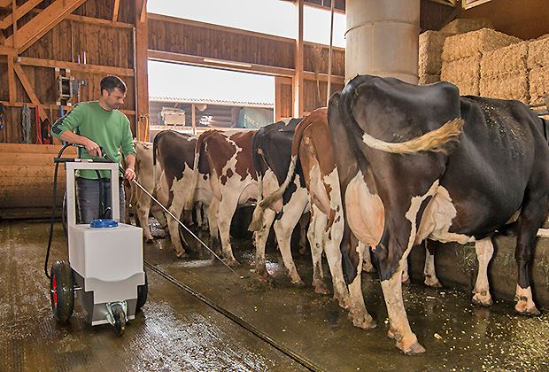 Bei Klauenbädern besteht die Gefahr, dass Krankheitserreger im Schmutzwasser von Kuh zu Kuh weiterverbreitet werden. Besser ist, die Klauen einzeln zu reinigen. Der MobiCleaner ist ein akkubetriebenes Gerät, das auch im Melkstand gut Platz findet. Die kurze Lanze ermöglicht ein effizientes Waschen der Klauen nach dem Melken.