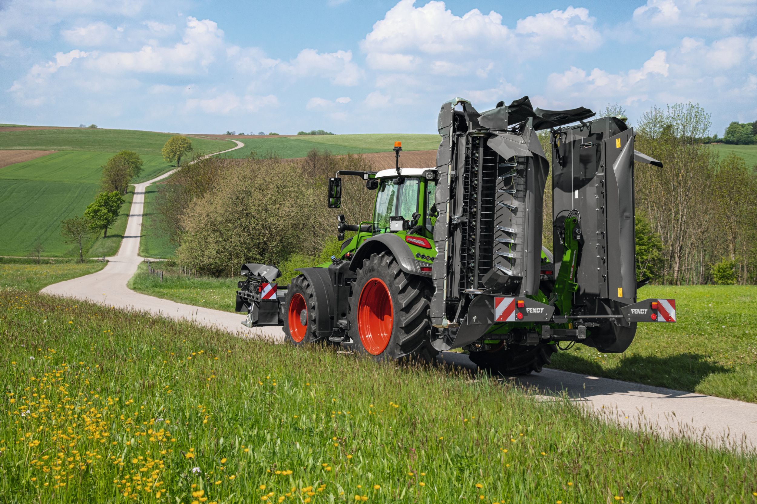 Der Schwerpunkt des Mähwerkes liegt niedrig und nah am Traktor. Dies steigert die Sicherheit im Strassentransport und die Transporthöhe liegt unter 4 m, so Fendt Der integrierte Kompensationszylinder verhindert ein Aufschaukeln und garantiert eine hohe Bodenfreiheit auch am Vorgewende.
