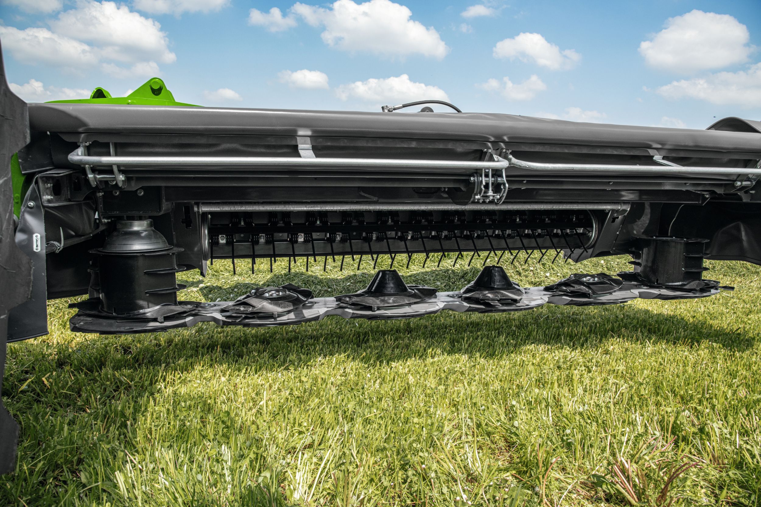 Der grosse Überschnitt zwischen den Mähscheiben erhöht die Schnittfläche und sorgt für einen sauberen Schnitt. Das Profil der Mähscheibe erzeugt eine Sogwirkung, die das Mähgut vor dem Schnitt anhebt und für einen gleichmässigeren Schnitt sorgt. «Dank diesem Strömungseffekt wird auch schweres Mähgut sauber zum Aufbereiter transportiert, aufbereitet und danach abgelegt», schreibt Fendt.