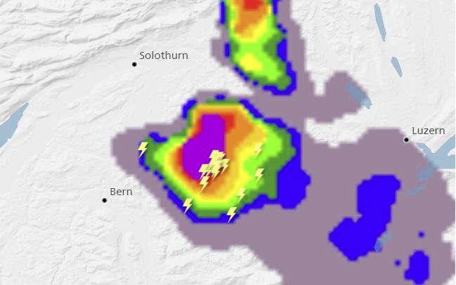 Wie Meteonews twitterte, hat ein Gewittercluster östlich von Bern immer wieder neue Hotspot produziert. Diese führten zu Hagelschlots. Die Gewitter zogen dann in südöstlicher Richtung weiter und zogen über das Entlebuch und das östliche Berner Oberland.