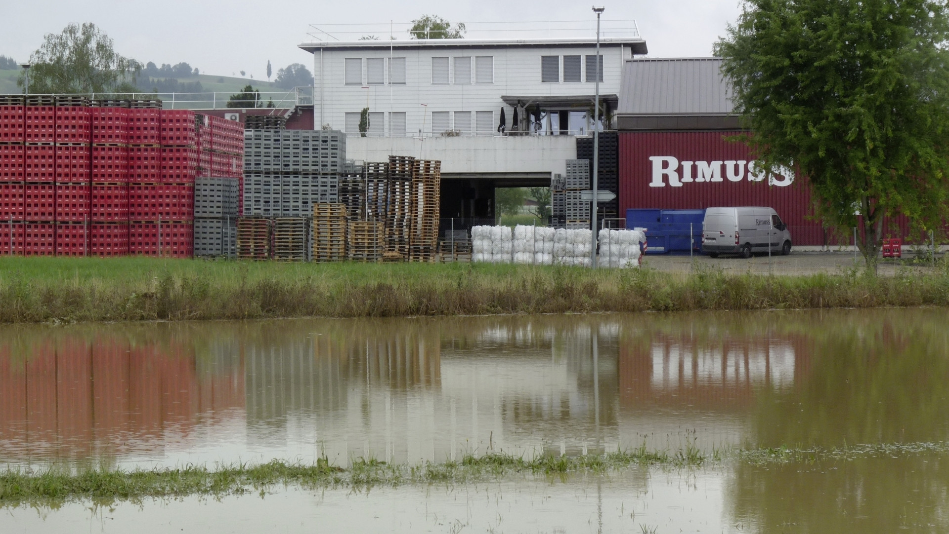Das Wasser der oberen Klettgaugemeinden sammelte sich in Hallau, wobei der Halbbach über die Ufer trat und das Gewerbegebiet überflutete. Die Rimuss & Strada Wein AG wurde dabei besonders hart getroffen.