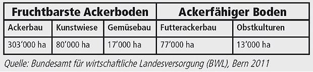 Das Bundesamt für wirtschaftliche Landesversorgung (BWL) hat ausgerechnet, dass die raumplanerisch ausgeschiedenen Fruchtfolgefla¨chen von 438'560 Hektar ausreichen um genügend Brotgetreide, Kartoffeln, Zuckerru¨ben und Raps, Kunstwiesen und Gemu¨se anzubauen. Werden Kulturen wie z.B. Futtergetreide oder Silomais etc. auf weniger ertragreichen Böden angesiedelt und das Nahrungsangebot mit tierischen Kalorien auf der Basis von Dauergrünland ergänzt, kann die aktuell in der Schweiz lebende Wohnbevölkerung mit einer ausgewogenen Mischernährung versorgt werden. Die Verteilung der Ackerfläche müsste dann etwa so aussehen: Siehe Grafik Ackerboden. ed