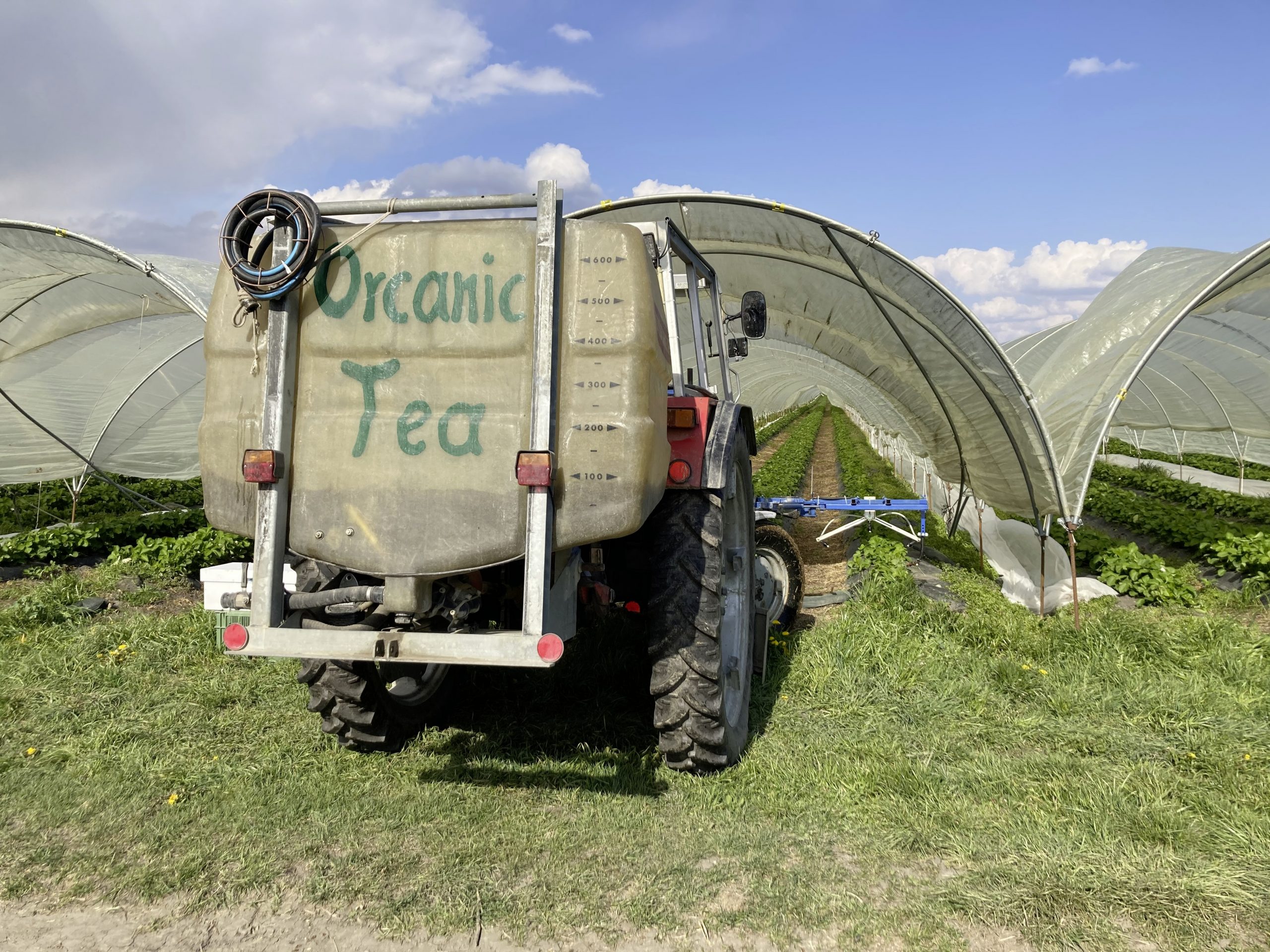 Auch bei Niederhausers Erdbeerkulturen kommt zwei- bis dreimal Fruchtkalk zum Einsatz: «Allerdings ist noch nicht bekannt, wie der Kalk auf die Mikroorganismen des Komposttees wirkt – ob er sie allenfalls kaputt macht», erklärt Patrik Niederhauser. Deshalb werde Kalk nur zur Desinfektion beim Ein- und Auswintern gespritzt und danach nicht mehr.