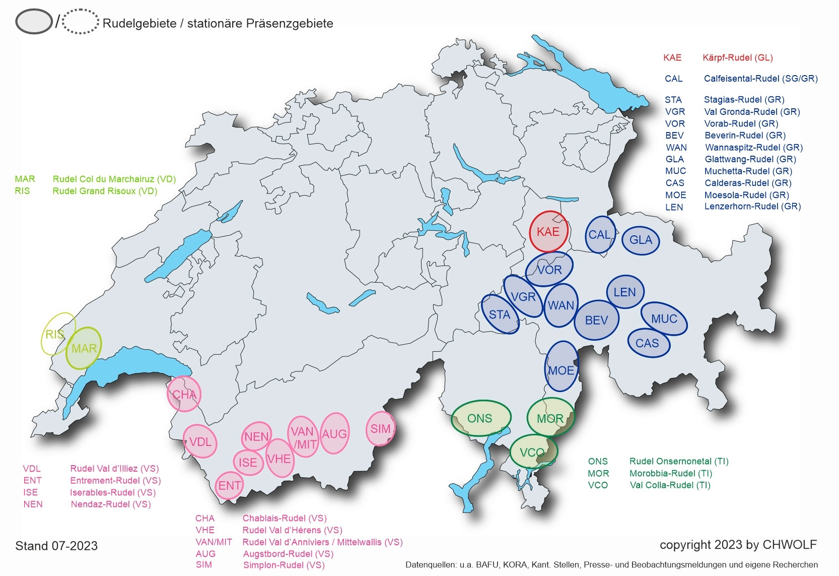 Die Karte gibt eine Übersicht über die aktuelle Wolfsrudelpräsenz in der Schweiz (Stand: 19.07.2023).