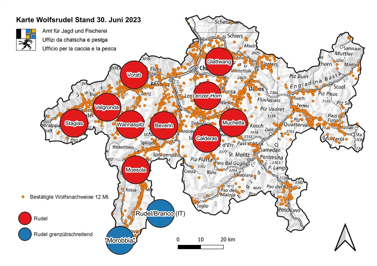 Die Karte gibt eine Übersicht über die aktuelle Wolfspräsenz (Rudel) im Kanton Graubünden (Stand: 30.06.2023).