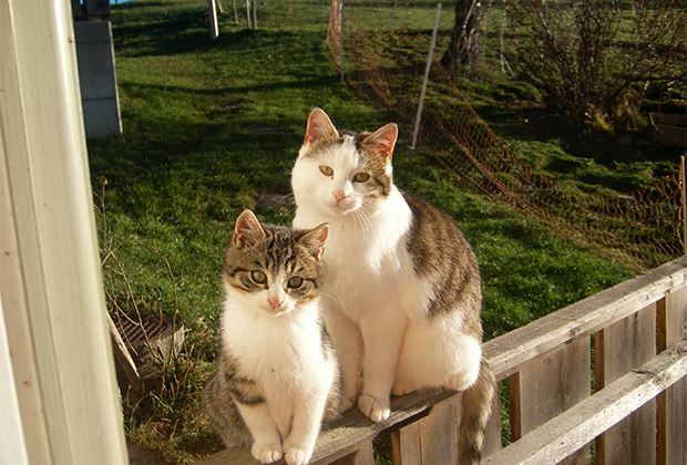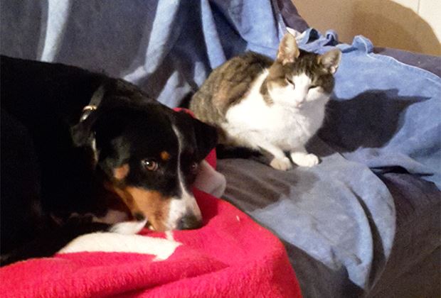 Diese Hofkatze hat einen ganz besonderen Namen. Sie heisst Spaghetti, hier zu sehen mit Hofhund Nero.
