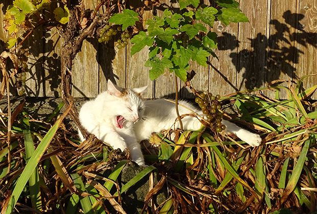 Diese Katze geniesst die wohltuenden Sonnenstrahlen nahe der Hausmauer.