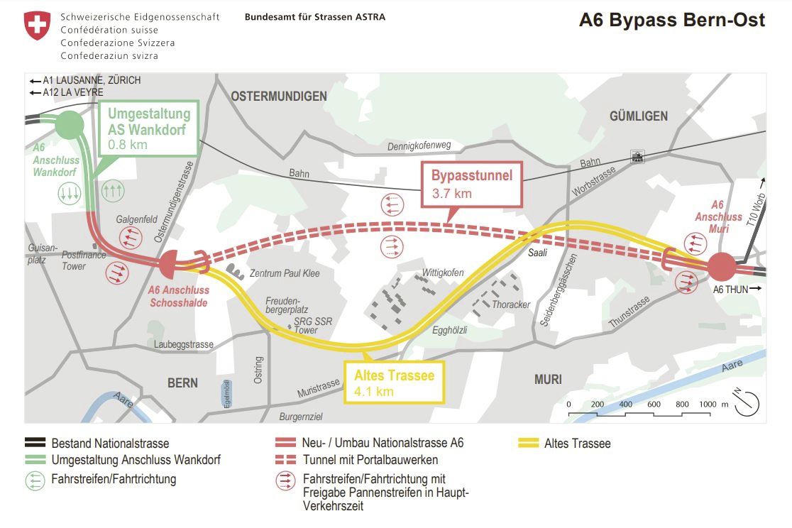 Die Autobahninfrastruktur um Bern ist in den Stosszeiten seit Jahren überlastet. Der Bund will mit mehreren Projekten Abhilfe schaffen. Eines davon ist die Verlegung der Autobahn zwischen der Schosshalde und dem Anschluss Muri in einen Tunnel unter der Erde. Oberirdisch fällt dann rund 75 Prozent des heutigen Verkehrs weg und der frei werdende Platz, den die heutige Autobahn benötigt, kann anderweitig genutzt werden.