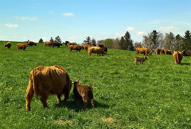 Warum der Hof den Zweitnamen "Highland Gurten" trägt, wird schnell klar: Ruedi Balsiger hat eine Vorliebe für Hochland-Rinder. Die zotteligen Tiere haben es ihm angetan - weil sie ihm gefallen, aber auch, weil diese Rinderart sehr genügsam und pflegeleicht ist. Sie brauchen kaum Medikamente, der Tierarzt kommt nur zwei Mal im Jahr. Bloss auf den Parasitenbefall muss der Bauer immer wieder ein Auge werfen.