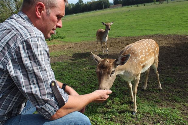 Kurz nachdem Martin Schurter das Gehege betreten hat und ruft, preschen schon die ersten Damhirsche an. Freudig machen sie sich über die mitgebrachten Graswürfel her. Auch wenn sie von den Menschen etwas Distanz halten, zeigen sie sich für Wildtiere sehr zutraulich.