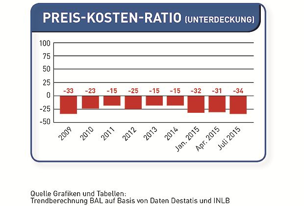 Den niedrigsten Auszahlungspreis gab es im Juli in Schleswig-Holstein mit 27,8 Cent pro Kilogramm Milch (April: 28,3 Cent) und den höchsten in Bayern mit 31,3 Cent (April: 33 Cent). Die Preis-Kosten-Ratio verschlechterte sich dagegen zu den letzten Quartalsergebnissen deutlich. Hatte die Unterdeckung der Milcherzeugungskosten im April noch 31 Prozent betragen (Ratio 0,69), stieg sie in der aktuellen Berechnung auf 34 Prozent (Ratio 0,66).