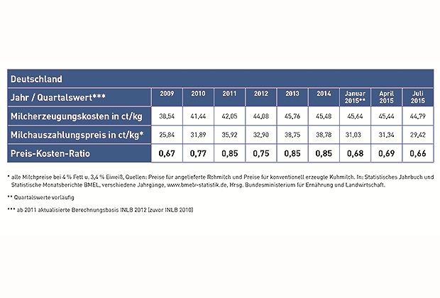 Die ausgewiesenen Milcherzeugungspreise für Deutschland sind den statistischen Monats- und Jahresberichten des BMELV entnommen und beziehen sich auf standardisierte Werte von 4 % Fett und 3,4 % Eiweiss.