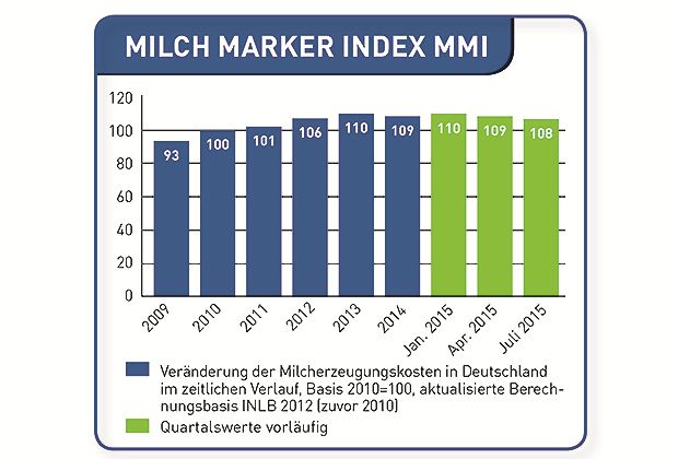 Der Milch Marker Index (MMI) beruht auf der Studie „Was kostet die Erzeugung von Milch?“. Der Index zeigt die Entwicklung der Milcherzeugungskosten auf und wird in regelmäßigen Abständen vom Büro für Agrarsoziologie und Landwirtschaft (BAL) aktualisiert. Die Preis-Kosten-Ratio verdeutlicht, inwieweit das „Milchgeld“ die Produktionskosten abdeckt. Die Berechnungen basieren auf Daten des Statistischen Bundesamtes (Destatis) und des InformationsNetzes Landwirtschaftlicher Buchführungen der EU (INLB).