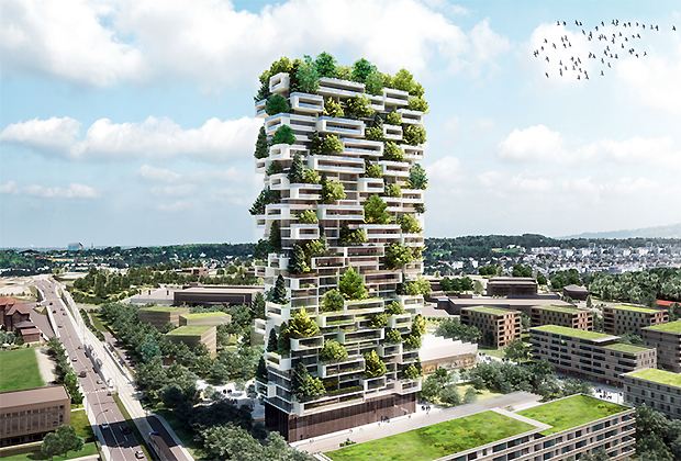 In Chavannes-près-Renens VD wird ein 117 Meter hohes Wohn- und Geschäftshaus gebaut, das nicht weniger als 80 Bäume und 3000 Quadratmeter Ziersträucher in der Fassade beherbergen soll. Es stammt aus der Feder eines Mailänder Architekten.
