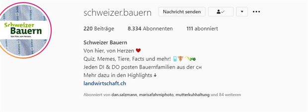 Der Instagram-Kanal von «Schweizer Bauern - „Von hier, von Herzen“ zählt schon deutlich mehr als 8'300 Follower. An zwei Tagen pro Woche übernehmen Bäuerinnen und Bauern den Kanal.