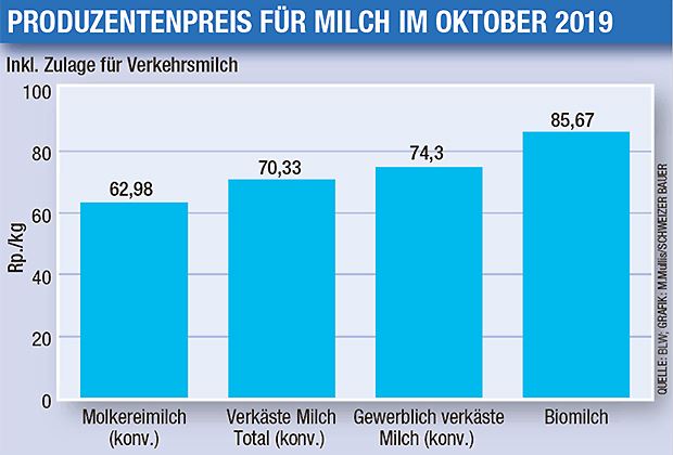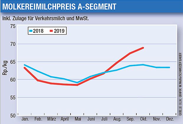 Am Ende aber funktionierte die Einführung des Grünen Teppichs per 1. September ordentlich. Geholfen hat dabei die rückläufige Milchmenge. «Wir sehen beim Grünen Teppich bis jetzt wirklich gute Resultate. Aber 2020 muss es weitergehen», sagt Reto Burkhardt, Kommunikationschef der Schweizer Milchproduzenten (SMP). Die Milchprodukte in den Läden hätten im Herbst zum Teil aufgeschlagen, und im September seien auch die Molkereimilchpreise markant gestiegen (vgl. Grafik).