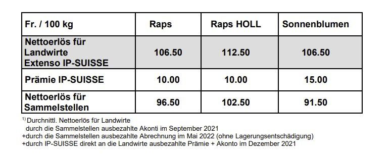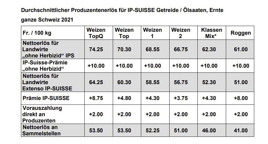 In der Tabelle sind die durchschnittlichen Produzentenerlöse für IP-Suisse-Getreide und -Ölsaaten der Ernte 2021 aufgeführt. Bei den Nettoauszahlungspreisen an die Sammelstellen handelt es sich um gesamtschweizerische Durchschnittspreise, die an die Sammelstellen bezahlt wurden. Diese Preise wurden durch verschiedene Faktoren beeinflusst: die Nähe zu einer Mühle, die Qualität des Weizens, der Zeitraum, in dem die Ware vermarktet wurde, die Struktur und die Ausstattung der Sammelstelle.
