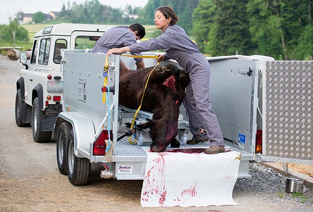 Als Transportmittel für die toten Tiere gibt es bereits drei Modelle eines Spezialanhängers, wovon einer durch die Behörden bewilligt wurde. Das bei der Tötung aufgefangene Blut wird ebenfalls gesammelt und mit den Innereien im Schlachtbetrieb entsorgt.