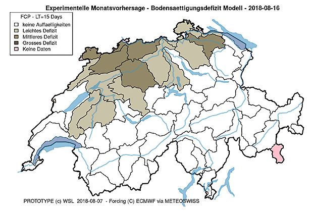 Hydrologen der Forschungsanstalt WSL testen derzeit eine 30-Tage-Trockenheitsvorhersage. Demnach könnten sich die ausgetrockneten Böden zumindest in manchen Gebieten der Schweiz bis Ende August erholen.