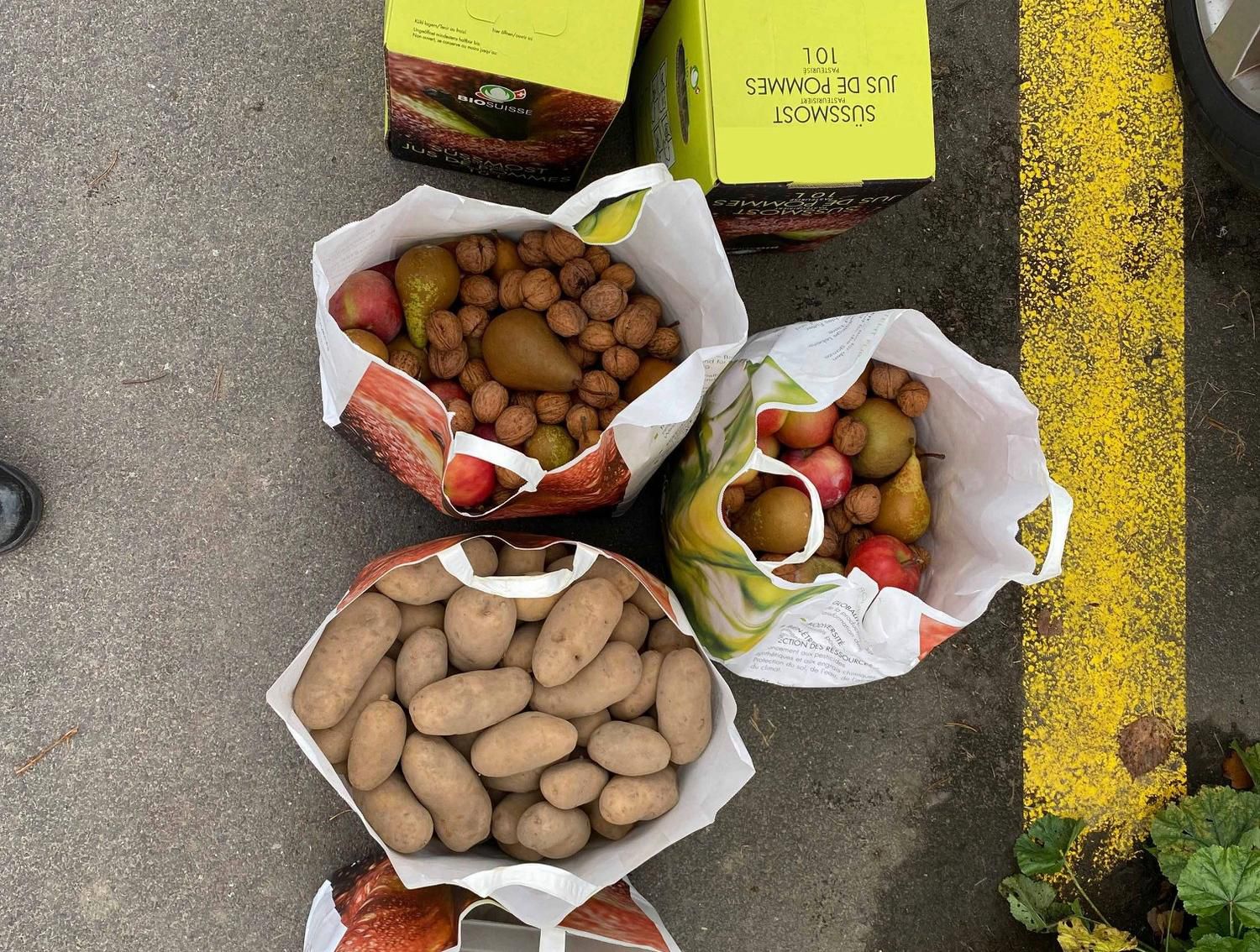 Gemäss Angaben der Polizei haben vier Männer zahlreiche Lebensmittel gestohlen. Sie haben insgesamt 25 Liter Most, 60 Eier, 12 kg Äpfel und Birnen, 1 kg Baumnüsse und 23 kg Kartoffeln in ihr Fahrzeug verladen.
