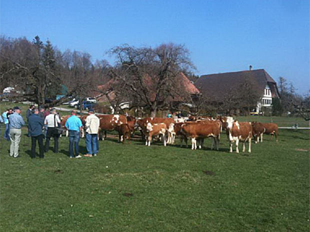 Anschliessend an die Versammlung besuchten die Teilnehmer den Betrieb von Monika und Fritz Bernhard. Der Hof liegt direkt am Moossee. Seit rund fünf Jahren betreibt die Familie hier Mutterkuhhaltung mit der Rasse Simmental. Dank dem Zukauf von mehreren Tieren aus der Herde der Strafanstalt Witzwil zeigen die 25 Kühe mit ihren Kälbern bereits ein hohes Zuchtniveau.