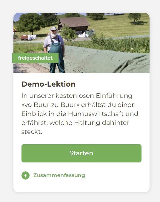 Jetzt ist eine Demo-Lektion online. Die Demo-Lektion ist eine Einführung in die Humuswirtschaft und den Aufbau von Humus auf einem produktiven Betrieb. Sie erklärt deren Vorteile, geht vertieft auf die dahinterstehende Haltung ein und zeigt auf, welche Fragen vor einer Umstellung zu beantworten sind. Betriebsleiterinnen und Betriebsleiter können zudem anhand von Selbst-Checks eine kurze persönliche Standortbestimmung machen.