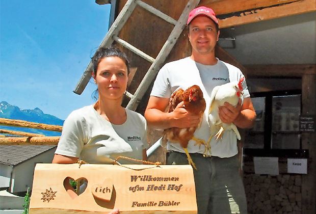 Schon früh setzten Bühlers auf Direktvermarktung. «Aber angefangen hat das noch ganz einfach», sagen Bühlers. An einem Grundsatz wollten die beiden von Anfang an festhalten: «Wir wollen speziell produzieren, und speziell vermarkten.» So verkaufen sie in ihrem rund um die Uhr geöffneten Hofladen etwa Bergkräuter- und Heumantel-Käse mit essbarer Rinde, obschon sie gar keine Milchkühe besitzen – oder gerade mal zwei, die sie bei einem anderen Bauern untergebracht haben und dafür im Sommer Käse von der Alp bekommen. Sie besitzen heute ausser Schafen und Legehennen noch 46 Mutterkühe – etwa zwei Drittel reine Simmentaler und ein Drittel Original Braunvieh, deren Fleisch sie verkaufen.