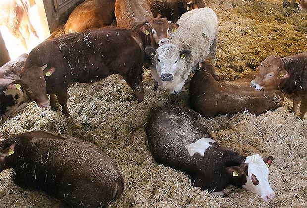 «Pro Tier und Tag verbrauche ich 5,5 kg Stroh», so Schwab. Ein Vorteil sei sein Aufstallungssystem. Die älteren Masttiere müssen durch einen Gang zu den weiter entfernten Futterplätzen laufen, auf dem Weg dorthin würden sie sich entleeren und dementsprechend die Tiefstreu weniger verschmutzen. Das Stroh produziert Schwab auf dem eigenen Betrieb und kauft Stroh aus der Region dazu.