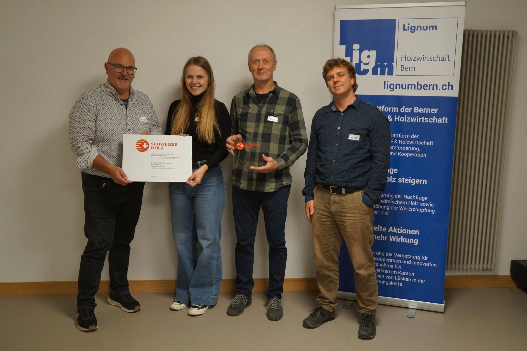 Für den Neubau des Schulhauses in Grasswil wurde die Gemeinde Seeberg BE mit dem Label «Schweizer Holz» ausgezeichnet. V.l.: Andreas Aeschbacher, Larissa Jenzer, Markus Wyss, Christian Marty.