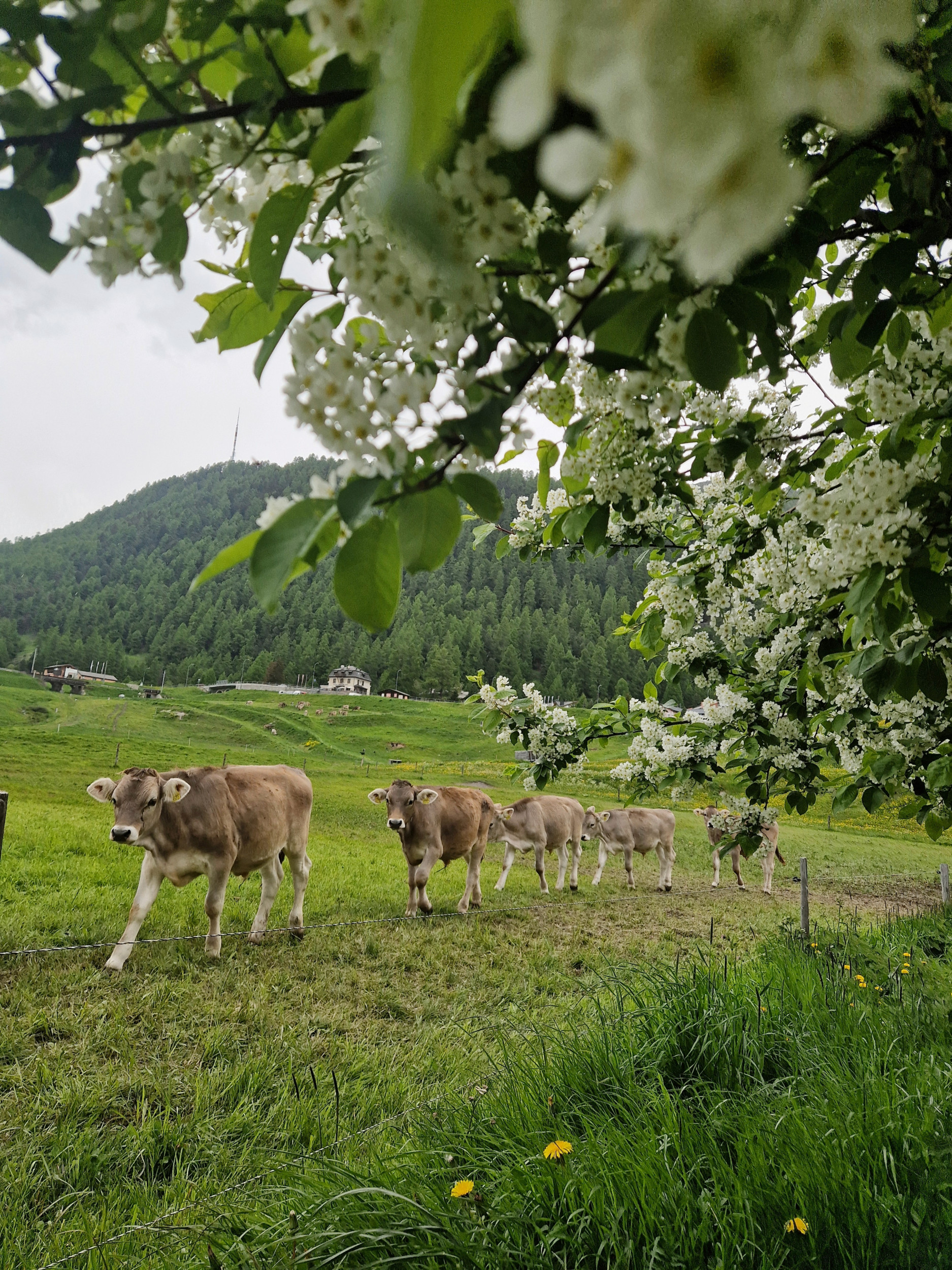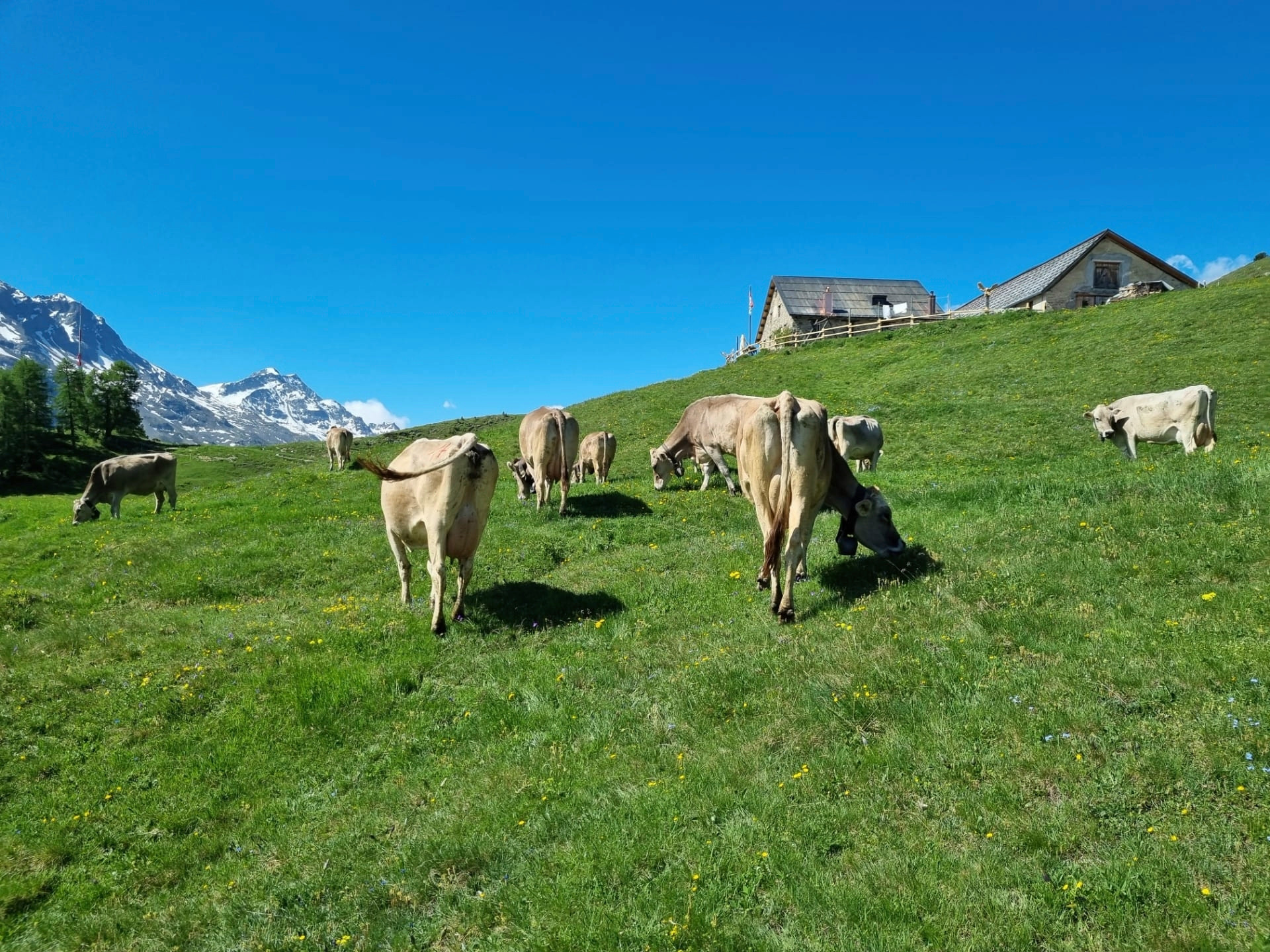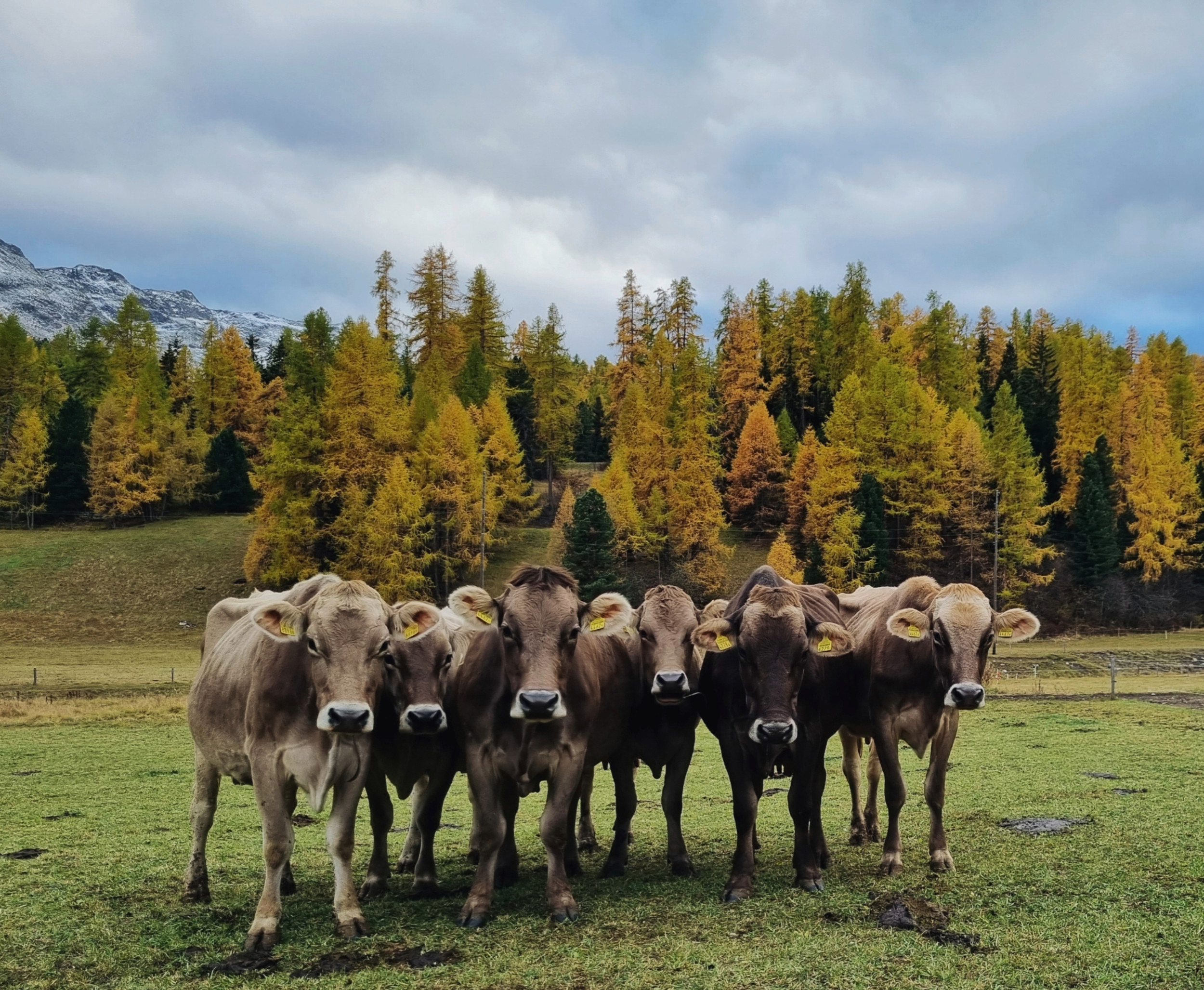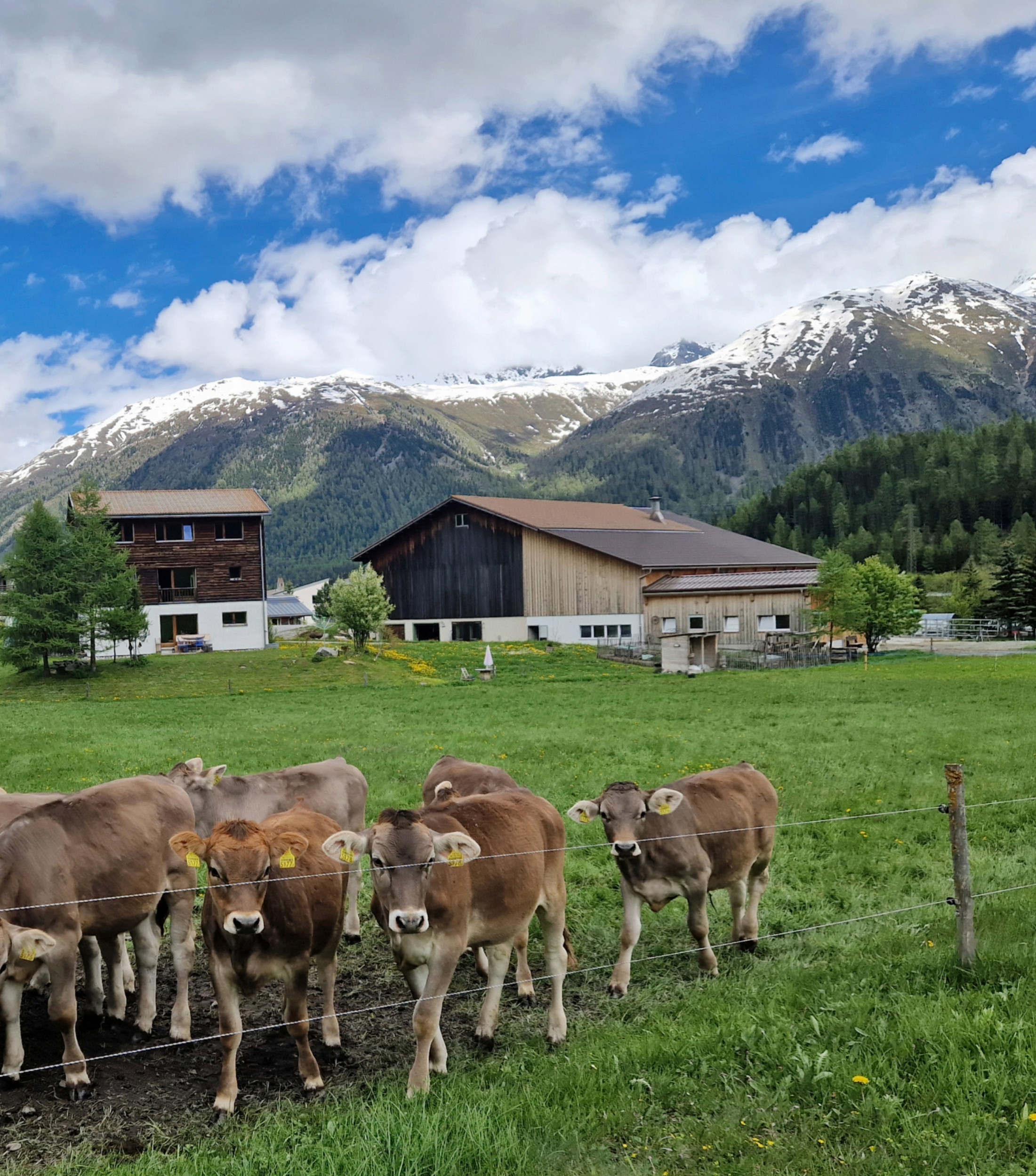 Auf dem Biohof von Peder in Celerina GR halten wir 18 Milchkühe, mit eigener Aufzucht. Seit diesem Winter bleiben alle Kälber bei uns auf dem Betrieb, mindestens, bis sie abgetränkt sind. Das machen wir für ein besseres Tierwohl. Daneben gibt es weitere Tiere auf dem Hof wie, Bündner Strahlziegen, Hühner und Schweine.