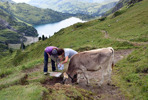 Für alles was nicht mit Homöopathie zu bekämpfen ist, ist schnell ein Tierarzt zur Stelle. So auch, als an einem Nachmittag beim Eintreiben der Tiere, bei einer Kuh eine grosse Wunde am Hals entdeckt wurde. Am Abend zuvor stiessen die beiden Sennerinnen auf eine faustgrosse Beule am Hals von Kuh Fanny. «Sie hat aber normal gefressen. Am nächsten Morgen floss bei ihr jedoch weniger Milch als gewohnt in den Kessel. Gefressen hat sie aber nach wie vor» sagt Meslissa. Weil der Tierarzt sowieso wegen einer lahmen Kuh vor Ort war, konnte er Fanny sofort untersuchen. Die Haut löste sich bereits grossflächig und sie blutete. «Eindeutig ein Schlangenbiss» meinte der Tierarzt. Nach der Behandlung durfte Fanny wieder in den Stall zu den anderen Kühen.