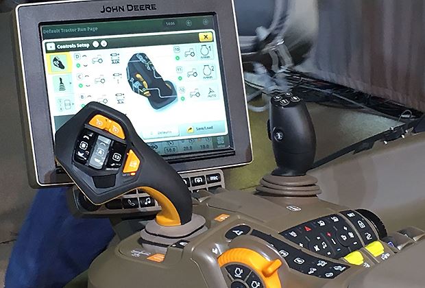 Bei der Hydraulik haben die beiden Neuen eine Förderleistung von 160 L/min. Gut, dass die maximalle Fördermenge bereits bei einer Motorendrehzahl von 1500 U/min zur Verfügung steht. Auch John Deere hat nun endlich einen Multifunktionshebel. Sie nennen ihn CommandPro. Bezüglich Ergonomie und Programmierungsmöglichkeiten bietet er alles, was des Fahrers Herzen höherschlagen lässt. Leider ist er im Moment nur in den beiden Topmodellen erhältlich, wobei John Deere durchblicken lässt, dass er über kurz oder lang auch auf den anderen Modellen der Serie 6R kommen wird.