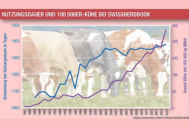 Die Entwicklung, dass die Milchkühe länger genutzt werden, zeigt sich auch in der Anzahl 100'000er-Kühe – wobei auch die steigende Milchleistung dazu führt, dass immer mehr Kühe diese magische Grenze knacken. Barenco: «Es gibt immer mehr Kühe, die in ihrem Leben schon über 100'000kg Milch gegeben haben.» Diese Aussage belegen die Zahlen von Swissherdbook. Demnach überschritten 1986 fünf Kühe die 100'000-kg-Marke. 2005 waren es 131. Im Jahr 2015 kamen insgesamt 371 neue 100'000er-Kühe hinzu.