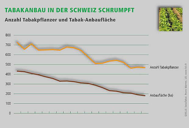 Während vor zehn Jahren noch 311 Schweizer Produzenten Tabak pflanzten, waren es letztes Jahr nur noch 180. In derselben Zeit ging die Anbaufläche von 644 auf 467 Hektaren zurück, wie aus dem Tätigkeitsbericht von Swiss Tabac hervorgeht.