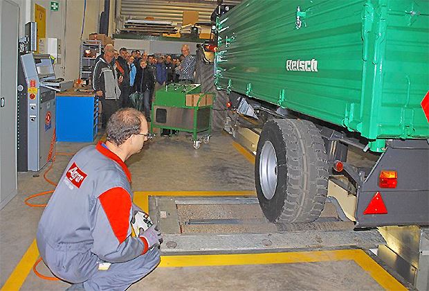 Während der Pause erklärten die Facharbeiter der Agrar Landtechnik AG, wie Bremsprüfungen professionell durchgeführt werden und worauf zu achten sei, wenn man die Kontrollen selber ausführe. Vonseiten der Polizei wurde auf die Ladungssicherungen hingewiesen und entsprechende Hilfsmittel und Werkzeuge vorgestellt.