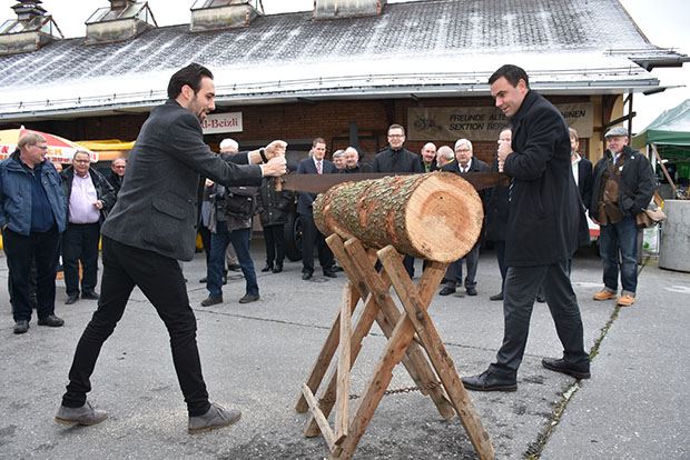 Eröffnungsredner Martin Rufer (rechts) vom Schweizerischen Bauernverband zusammen mit Messeleiter Christoph Studer bei der traditionellen Eröffnung mit der Zweimannssäge.