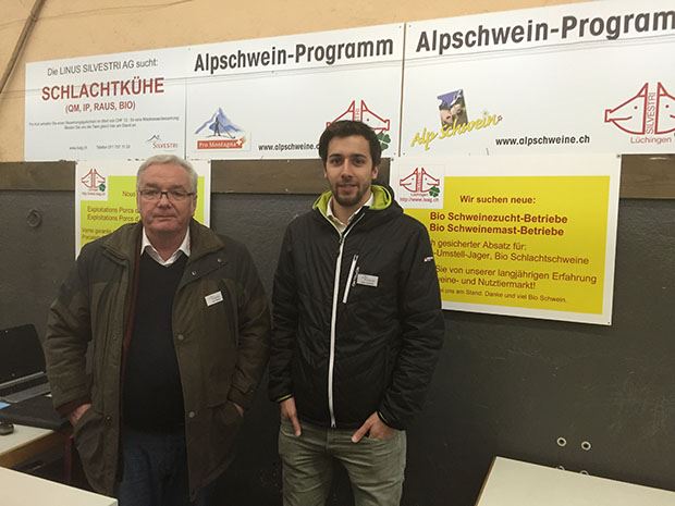 Jakob Spring (l.) und Silas Länzlinger von der Linus Silvestri AG suchen Aplschweinproduzenten.