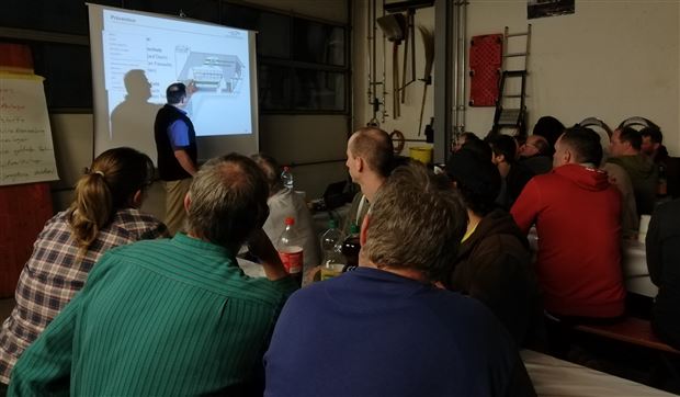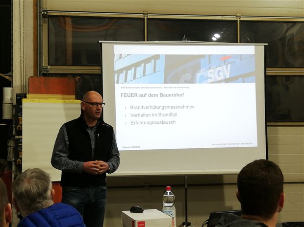 Markus Grenacher, Feuerwehrinspektor, zeigte auf, wie beim Ausbruch des Brandes gehandelt werden soll. Besonders die Tiere stellen für die Feuerwehr eine Herausforderung dar, da sie bei einem solchen Ereignis meist irrational reagieren. Die Unterstützung von benachbarten Landwirten kann die Situation entschärfen. Ausserdem kann der Betriebsleiter die Feuerwehr unterstützen, indem er auf besondere Gegebenheiten des Hofes aufmerksam macht. Die Feuerwehr kommt so zu einem taktischen Vorteil.