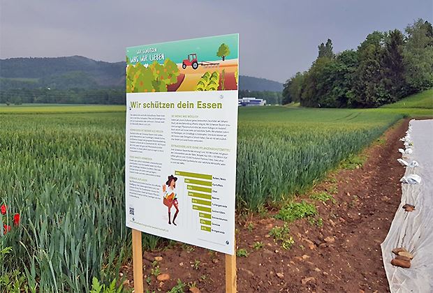 Entlang von Feldwegen sind die Informationstafeln vom SBV aufgestellt. «Das Schweizer Trinkwasser ist von einwandfreier Qualität», steht etwa darauf.