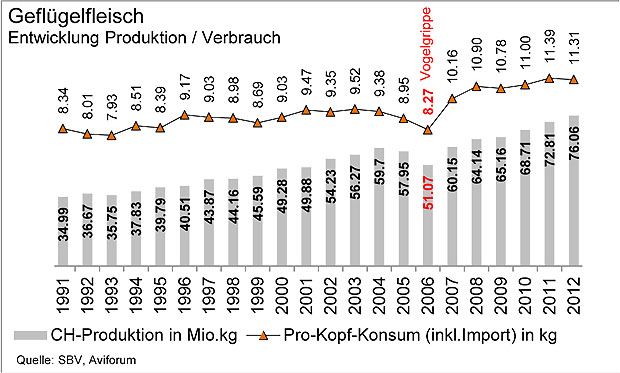Den einheimischen Geflügelfleischproduzenten gelang es, die Produktion deutlich zu steigern. Diese hat sich von 35 Millionen Kilogramm im Jahre 1991 auf über 76 Millionen Kilogramm mehr als verdoppelt. Die Schweizer Produzenten konnten ihren Marktanteil vor allem im Frischfleischbereich spürbar erhöhen. Beim Geflügel insgesamt stieg der Selbstversorgungsgrad im vergangenen Jahr auf 52,8% (+2% gegenüber 2011). Seit 2009 legte die einheimische Produktion jährlich auch um fast 4 Millionen Kilogramm zu.