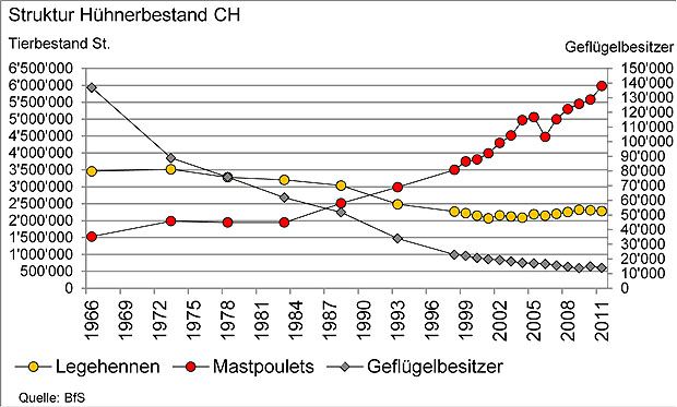 Der Strukturwandel in der Landwirtschaft erfasste auch den Geflügelsektor. 1966 gab es in der Schweiz noch 136'985 Geflügelhalter (!); 45 Jahre später, also 2011, sank dieser Wert auf 14'019 Halter. Die Anzahl Mastpoulet erhöhte sich in dieser Zeitspanne von 1,5 Mio. auf knapp 6 Mio. Stück. Bei den Legehennen zeigte der Trend in die andere Richtung. Deren Bestände reduzierten sich von 3,46 Mio. (1966) auf 2,28 Mio. Legehennen. Seit 1999 sind diese aber in etwa konstant. „Der Zuchtfortschritt und die grösseren Betriebe führten zu einer höheren Legeleistung und einer kürzeren Mastdauer“, schreibt das BLW. Der Legehennen-Bestand habe so abgebaut und die Mastpoulet-Produktion gesteigert werden können.