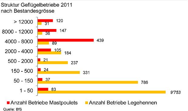 Auch die Grösse der Betriebe hat sich deutlich verändert. Die Geflügelfleischproduktion wurde professionalisiert, rund 45 Prozent der Betriebe (439) halten gemäss den Marktbeobachtern zwischen 4’000 und 8'000 Masthühner. 120 Betriebe können sogar über 12'000 Stück ihr eigen nennen. Die Professionalisierung zeigt sich auch darin, dass über 70 Prozent der Produzenten Bestände in den drei obersten Betriebsklassen (4’000-8'000, 8'000-12'000 und über 12'000) halten. In der Schweiz wurden im Jahre 2011 noch rund 980 Mastpouletproduzenten gezählt.